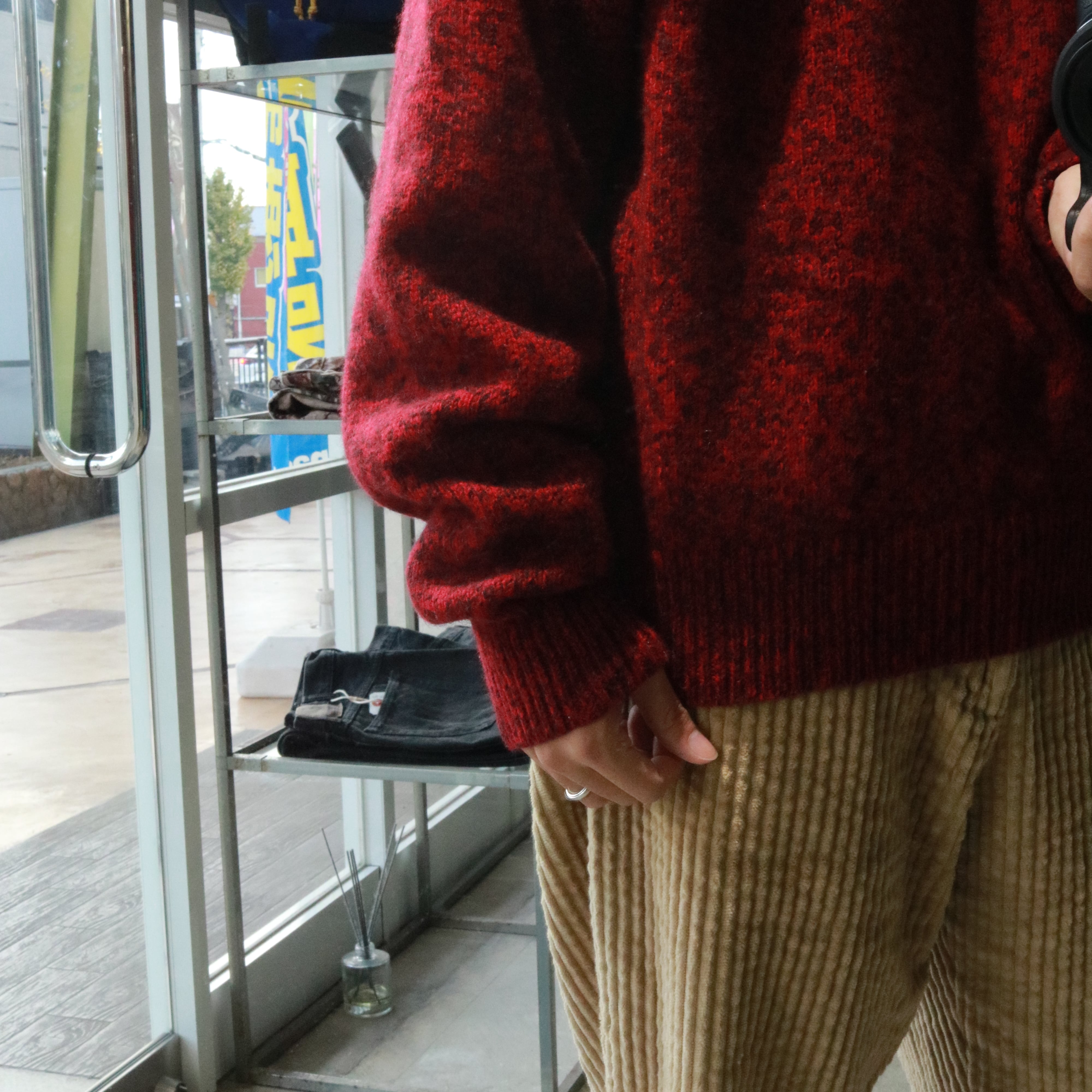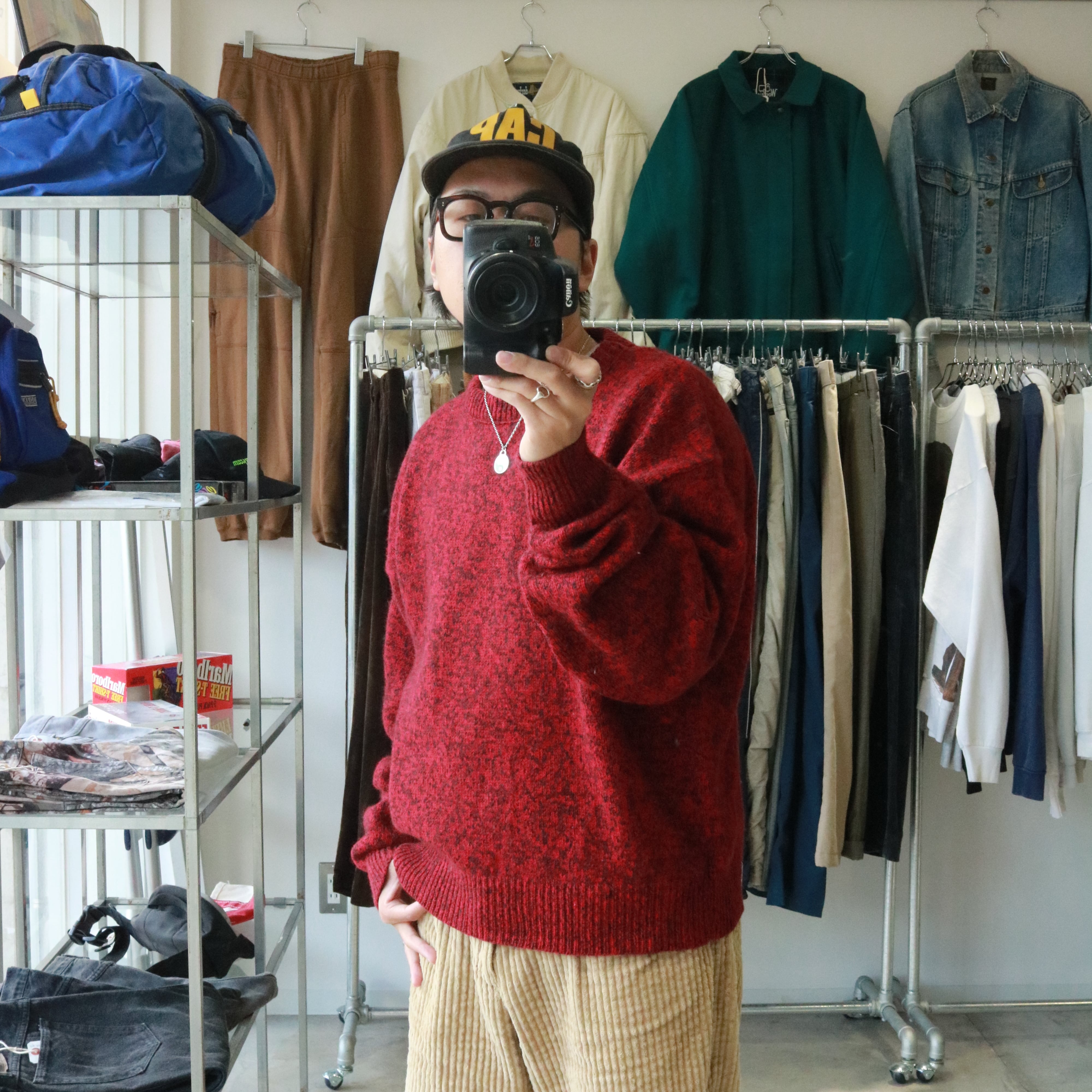 赤ベースのニットに